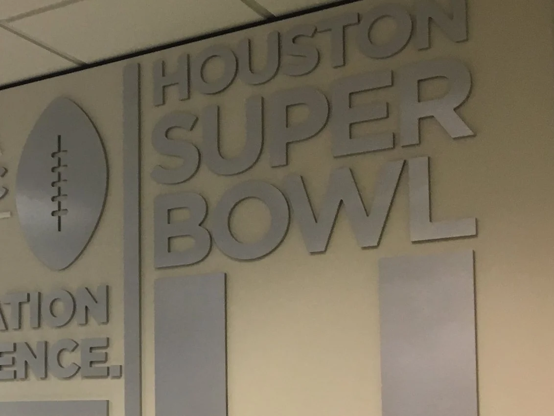 When the Super Bowl LI was hosted in Houston, the Houston Super Bowl Host Committee (HSBHC) was form. When the HSBHC moved into their new offices, they wanted their seven core values to be big part part of their new space. First, we incorporated those seven values (teamwork, integrity, innovation, community-centric, collaboration, excellence, and fun) into a mission statement. To avoid just putting up a long sentence, we broke up the statement into three separate spaces and added graphics to create a dynamic wall art installation. We made sure to highlight the original core values by making them in a bold weight, and a silver color to contrast the white.
